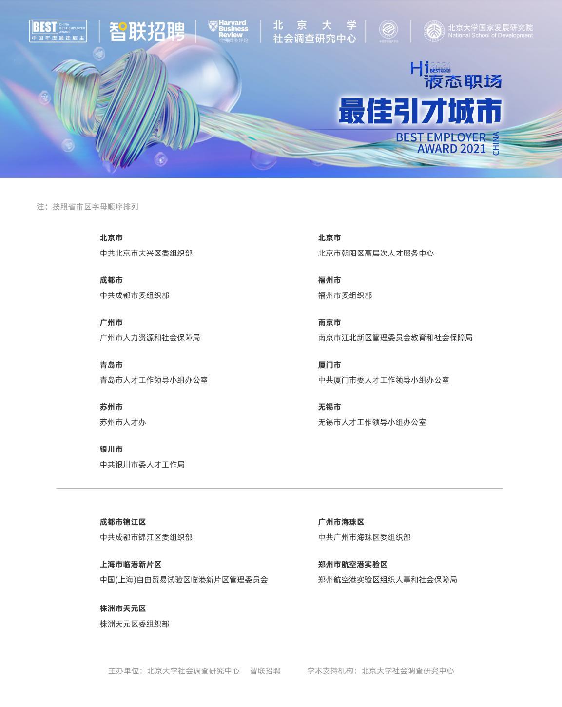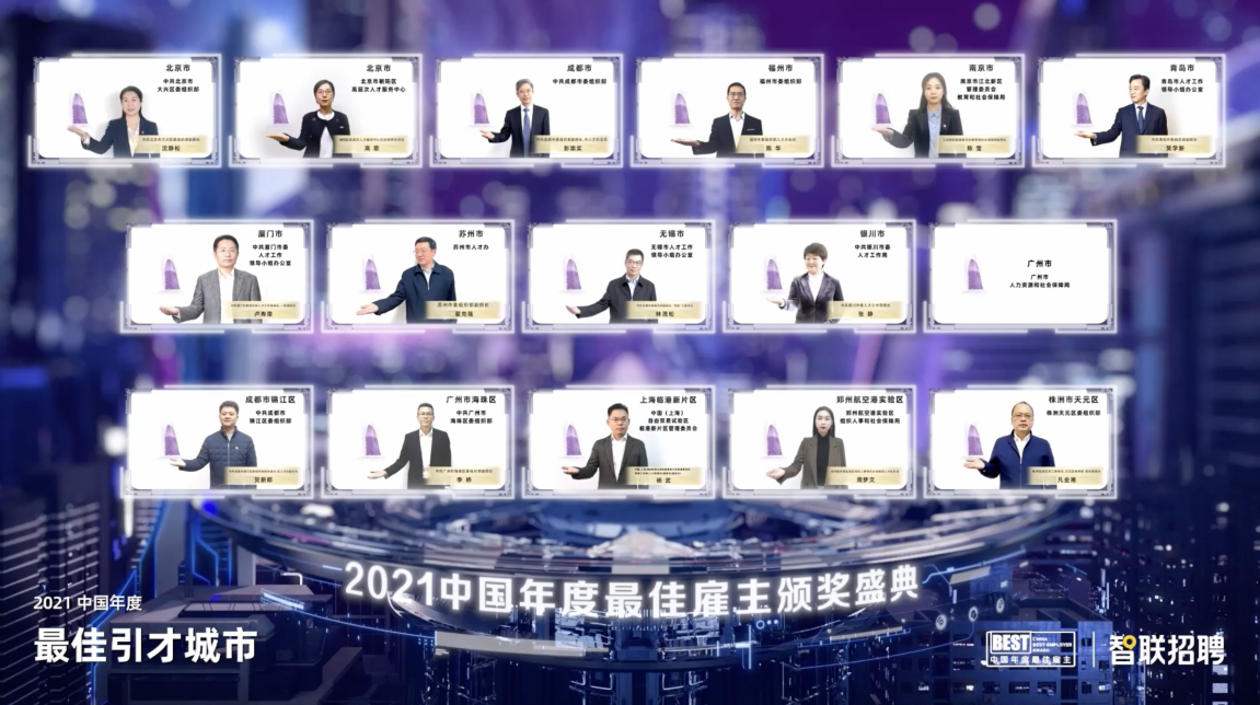 在智联招聘2021中国年度最佳雇主评选中,北京市、成都市、福州市、广州市、南京市、青岛市、厦门市、苏州市、无锡市、银川市荣获“最佳引才城市”称号;成都市锦江区、广州市海珠区、上海市临港新片区、郑州市航空港实验区、株洲市天元区同时荣获“最佳引才城市(区县级)”殊荣。
